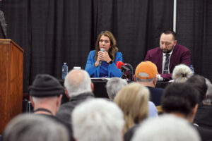 Brooks-Medicine Hat MLA and Premier Danielle Smith responds to questions with Cypress-Medicine Hat MLA Justin Wright at their biannual town hall event Saturday.--News Photo Zoe MasonAt a constituency town hall event Saturday morning, Medicine Hat’s two MLAs expressed their views on separation after the premier told reporters last week the referendum question on Alberta independence could be added to the ballot this October.
